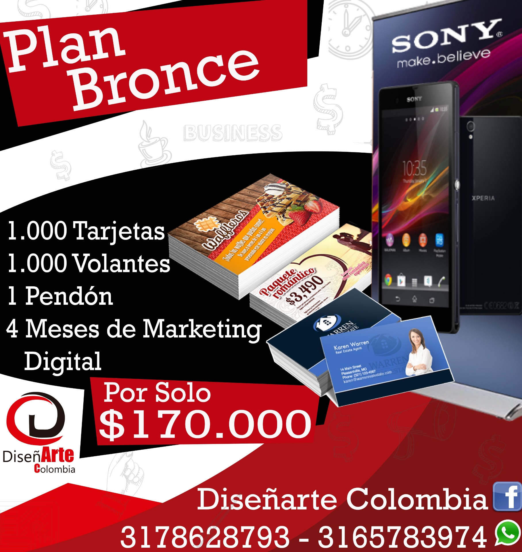 El Plan Bronce consta de 1.000 tarjetas de presentación full color una cara y la cara posterior en blanco y negro, 1.000 Volantes full color en propalcote con medidas de 11,5x16, 1 Pendón en lona full color de 70x1,20 y 4 meses de marketing digital. Él envió del material se realiza en contraentraga.