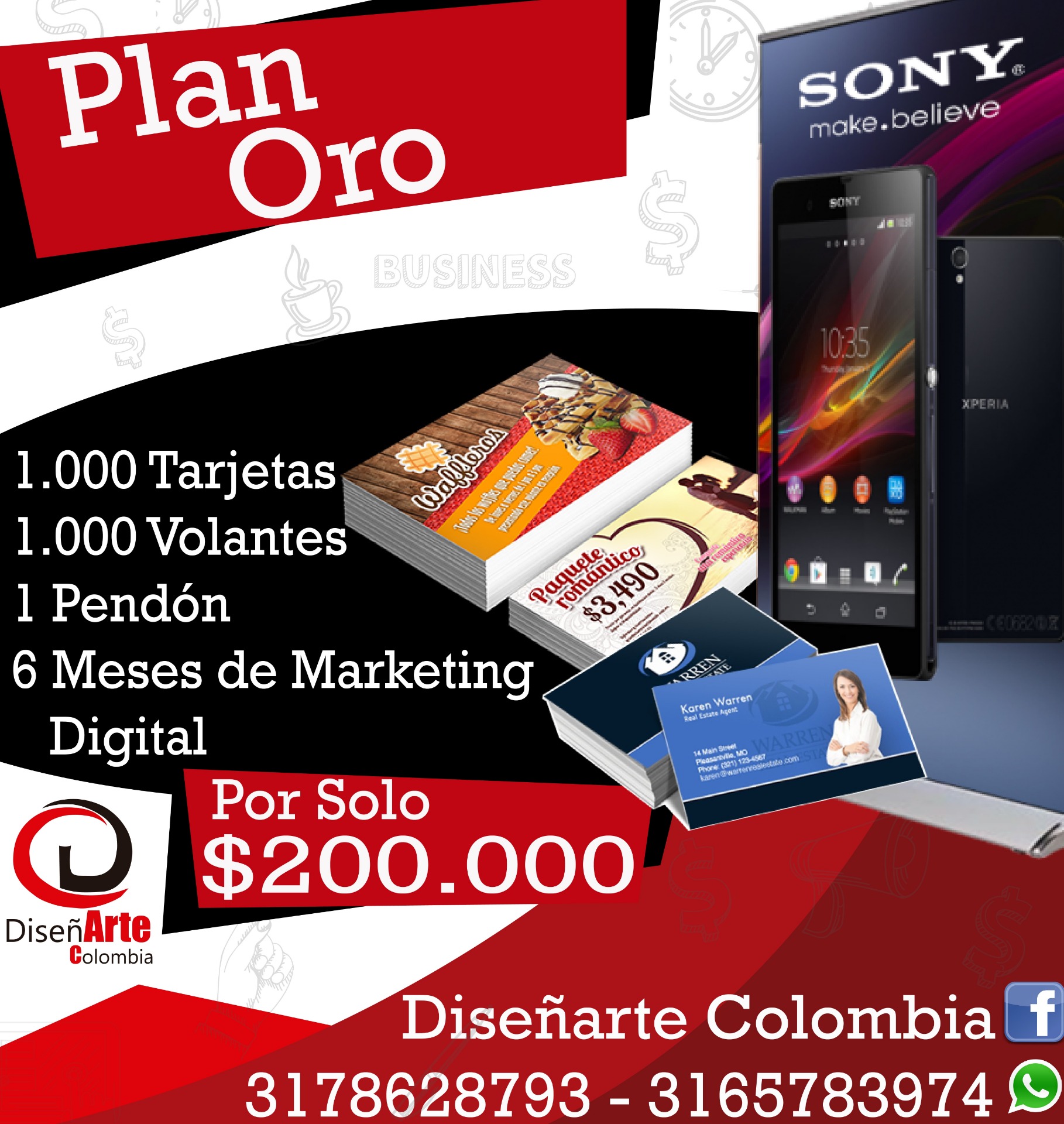 El Plan Oro consta de 1.000 tarjetas de presentación full color una cara y la cara posterior en blanco y negro, 1.000 Volantes full color en propalcote con medidas de 11,5x16, 1 Pendón en lona full color de 70x1,20 y 6 meses de marketing digital. Él envió del material se realiza en contraentraga.