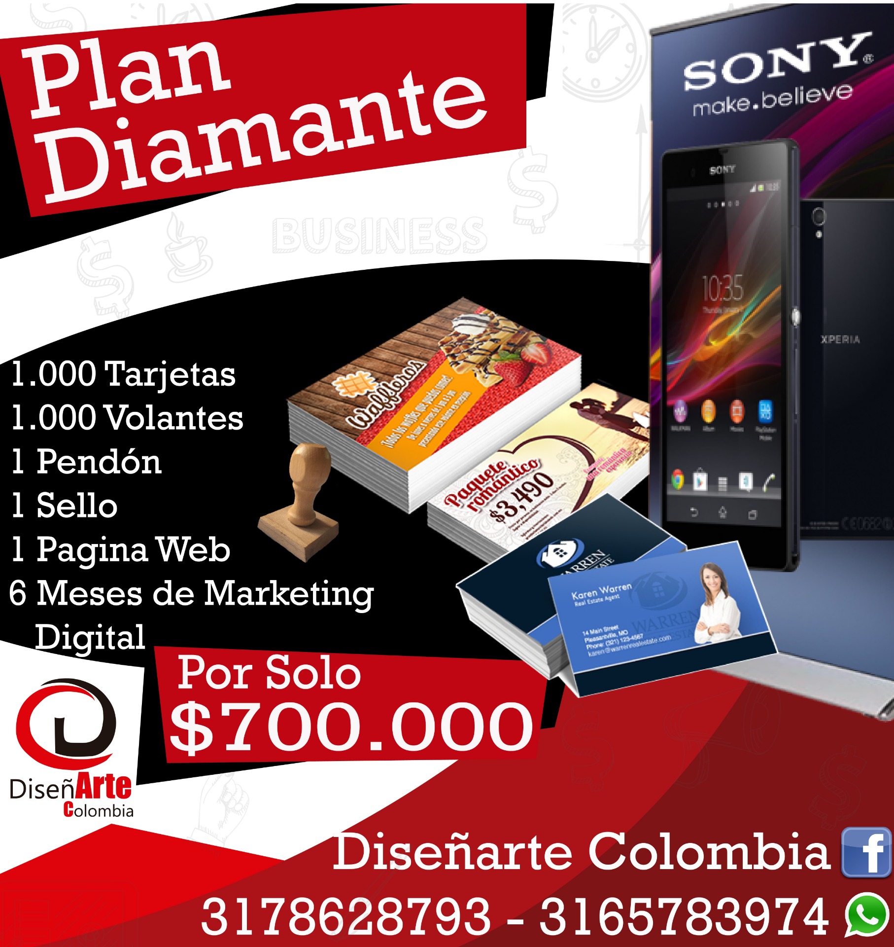 El Plan Diamante consta de 1.000 tarjetas de presentación full color una cara y la cara posterior en blanco y negro, 1.000 Volantes full color en propalcote con medidas de 11,5x16, 1 Pendón en lona full color de 70x1,20, 1 sello en madera de 4x4, 6 meses de marketing digital, 1 página web. La Página Web es por un año con su respectivo Hosting y dominio, cuenta con correos corporativos, chat de la página, 5GB, Velocidad ultra Rápida, Calidad Certificada ISO 9001:2015, Pagos en Línea, carrito de compras, seguridad alta, Certificado SSL. Él envió del material se realiza en contraentraga.